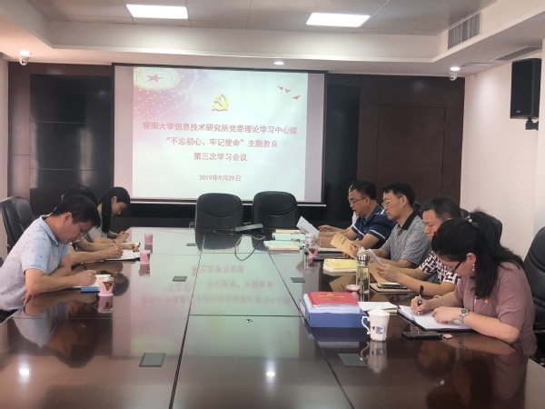 2019年9月29日,我所党委理论学习中心组在八楼会议室召开“不忘初心、牢记使命”主题教育第三次学习会议,谈及各自的学习体会。学校教育学院党委书记廖仕湖、组织委员周乐平、纪检委员郑凡强一行前来进行指导,会议由刘远忠书记主持,所党委委员刘明、唐孟华、卢灵、区小莹参加了本次会议。