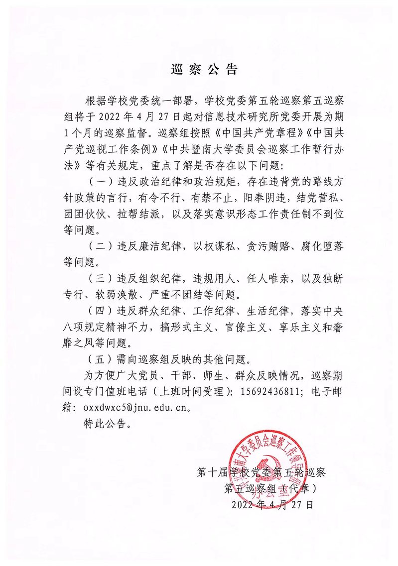 学校党委第五轮巡察第五巡察组巡察信息技术研究所党委的公告