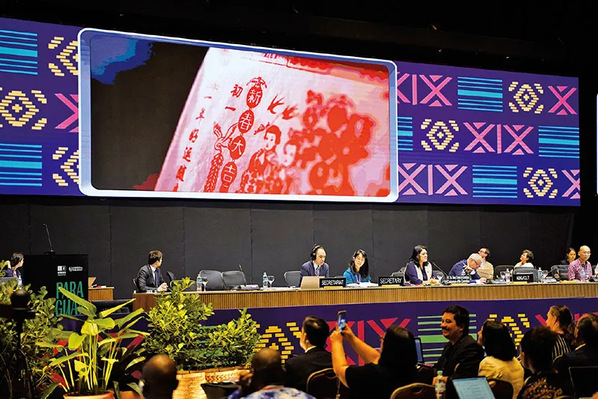 2024年12月4日,“春节——中国人庆祝传统新年的社会实践”成功列入联合国教科文组织人类非物质文化遗产代表作名录。寄托了中国人的人伦情感、家国情怀,体现了人与自然和谐共生、人与人和睦相处的价值理念的春节文化将更好走向世界。图为12月4日,在巴拉圭亚松森联合国教科文组织保护非物质文化遗产政府间委员会第19届常会评审现场,大屏幕播放春节宣传视频。 新华社记者 朱雨博/摄