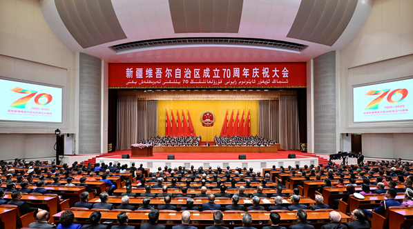 王沪宁发表讲话。他说,70年前,在党中央亲切关怀和党的民族政策光辉照耀下,新疆维吾尔自治区宣告成立。70年来特别是新时代以来,在党的领导下,新疆各族人民共同当家作主,不断夺取社会主义革命、建设和改革开放的伟大胜利。以习近平同志为核心的党中央坚持从战略上审视和谋划新疆工作,确立新时代党的治疆方略,推动新疆各项事业取得历史性成就,新疆同全国一道打赢脱贫攻坚战、全面建成小康社会,新疆各民族大团结不断巩固深化、中华民族共同体意识深入人心,各族人民像石榴籽一样紧紧抱在一起、昂首阔步走在中国式现代化道路上。