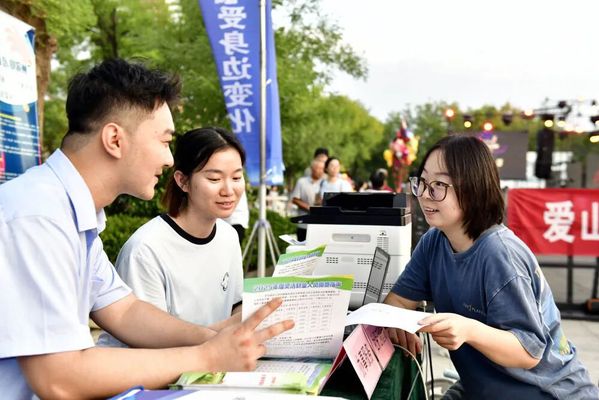 在山东省滨州市惠民县孙武广场,人社局的工作人员向市民介绍社保证明查询相关服务(2025年8月25日摄)。新华社记者 郭绪雷 摄